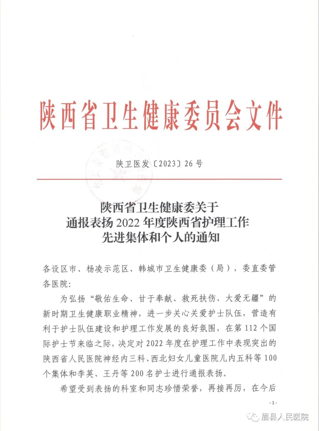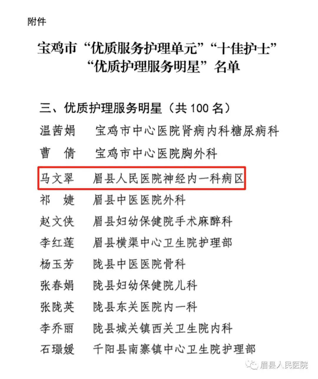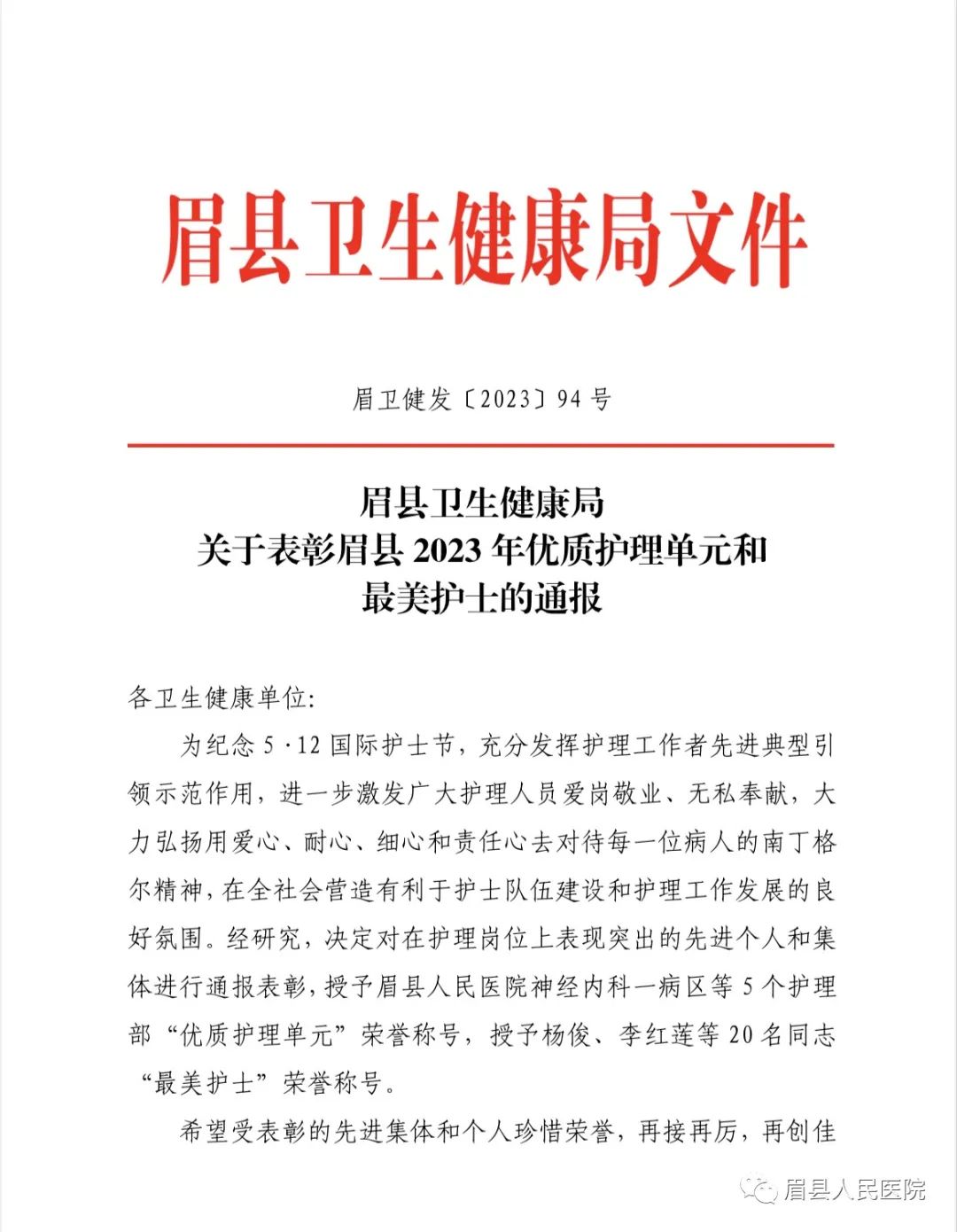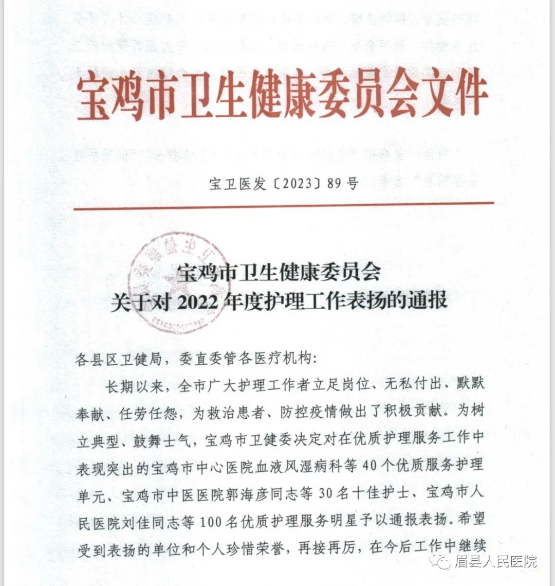 近日,陕西省卫生健康委员会印发《关于通报表扬2022年度陕西省护理工作先进集体和个人的通知》,我院心血管内科一病区护理单元被评为先进集体;宝鸡市卫生健康委员会印发《关于对2022年护理工作表扬的通报》,我院马文翠被评为“优质护理服务明星”;眉县卫生健康局印发《关于表彰眉县2023年优质护理单元和最美护士的通报》,我院神经内科一病区护理单元被评为2022年度“优质护理单元”,杨俊、李荣、汪浩丽、饶婷婷等4名护理人员被评为2022年度“最美护士”荣誉称号。
